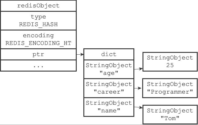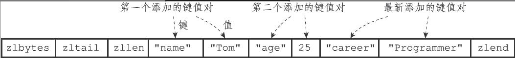 ziplist编码:每当有新的键值对要加入时,会先键推入到压缩列表表尾,然后再将值推入到列表表尾,因此:同一键值对的两个节点总是紧挨在一起,保存键的节点在前,保存值的节点在后;先添加到哈希对象中的键值对会被放到压缩列表的表头方向,后添加的键值对会被放在列表的表尾方向;