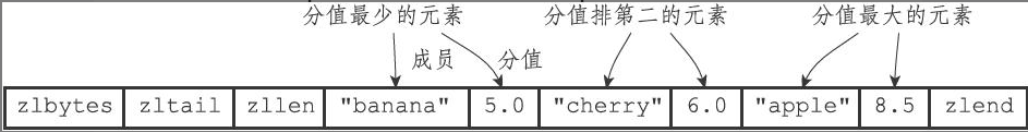 当ziplist作为有序集合的底层实现时,每个元素使用两个紧挨在一起的压缩列表节点保存,第一个节点保存元素的成员,而第二个元素则保存元素的分值;集合元素按照分值从小到大进行排序,分值较小的元素在靠近表头的方向。