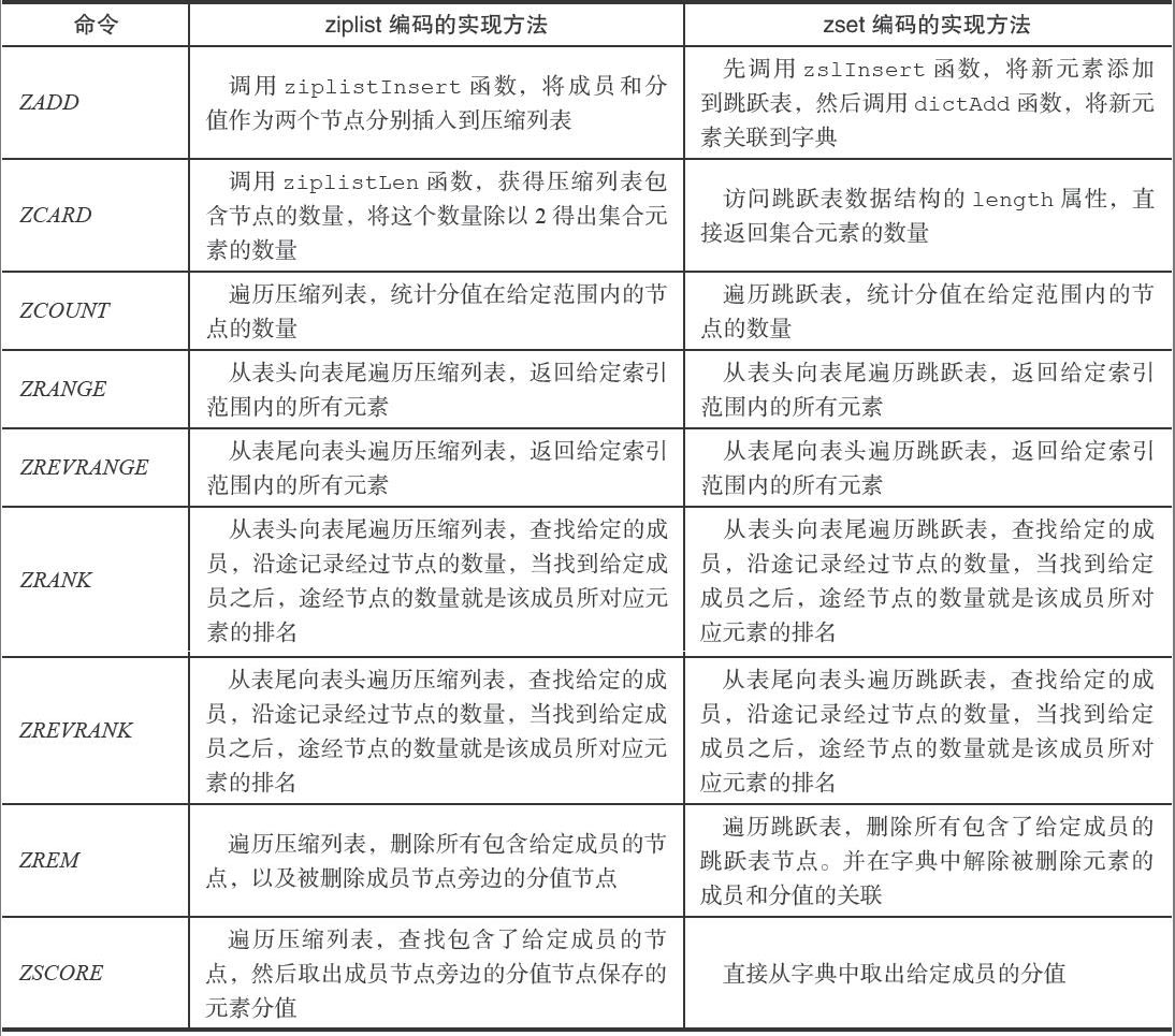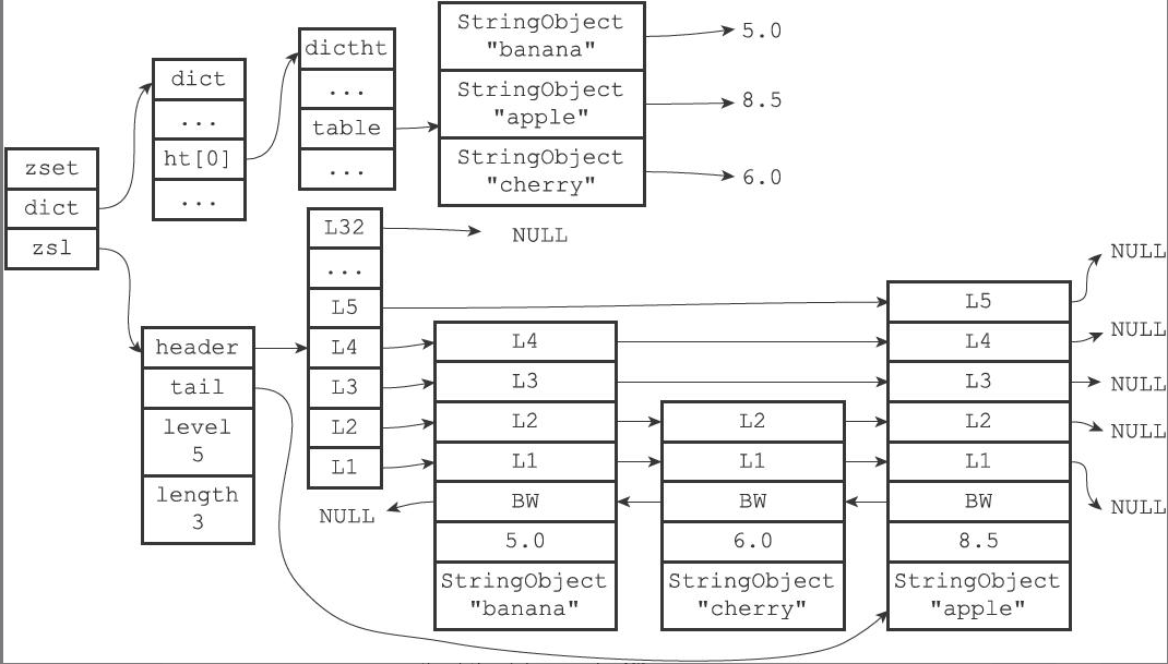 skiplist编码的有序集合对象使用zset结构作为底层实现,一个zset结构同时包含一个字典和一个跳跃表。zset结构中的zsl跳跃表按分值从小到大保存了所有集合元素,每个跳跃表节点都保存了一个集合元素:跳跃表节点的object属性保存了元素的成员,而跳跃表节点的score属性则保存了元素的分值,通过这个跳跃表,程序可以对有序集合进行范围型操作,比如zrank,zrange等命令。