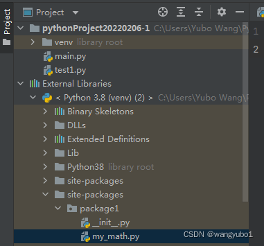 文件被写入到了site-package目录下,此时在pycharm软件左侧的External Libraries——site-packages中就会出现package1的包,里面包含安装的模块my_math.py。自此,完成模块的安装,在本项目以及其他新建项目中,都可以导入此包下的模块。