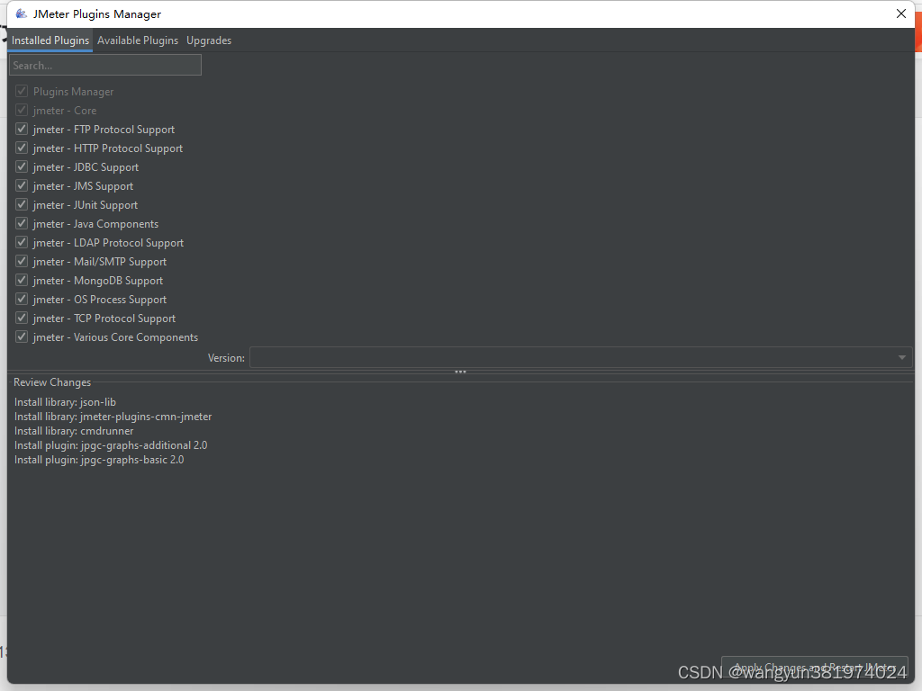 Upgrades(可更新的插件):即可以更新到最新版本的一些插件,可以通过点击截图右下角的Apply Changes and Restart Jmeter按钮来下载更新;