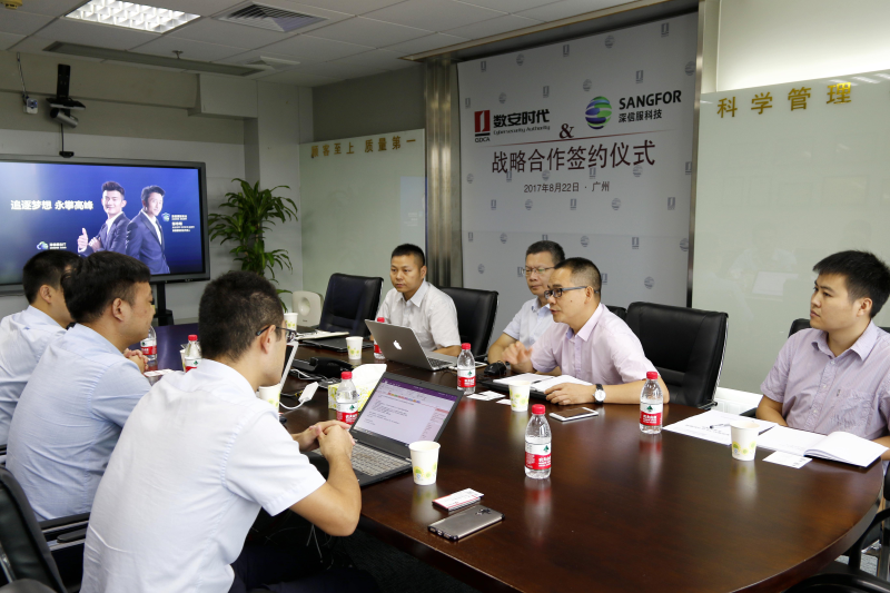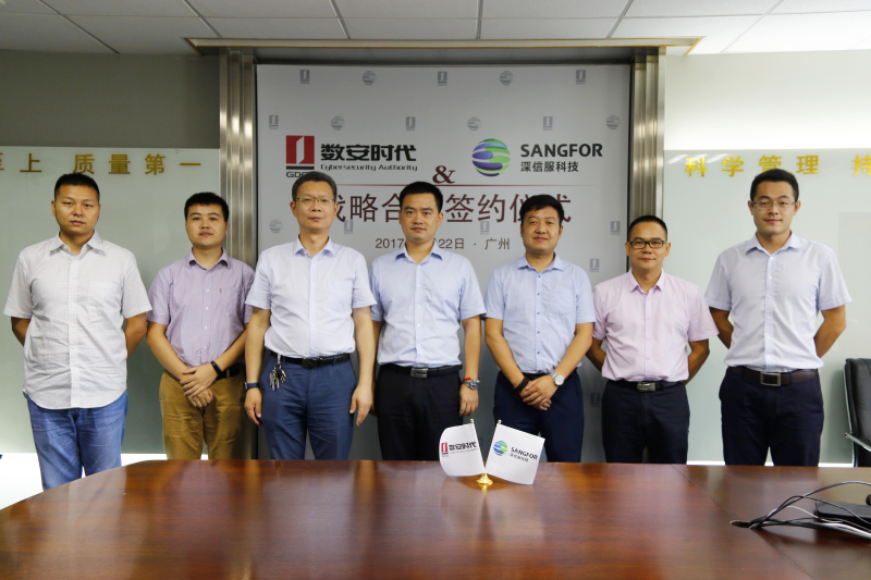 8月22日上午,国内信息安全服务商数安时代(GDCA)与国内网络安全厂商深信服在数安时代广州分公司成悦大厦正式签订战略合作协,以统一的资源整合优势结成长期共同发展联盟。其中,数安时代(GDCA)副总经理魏一才、国际电子认证事业部总监区景安代表数安时代出席签约活动。