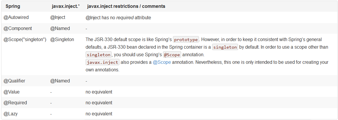 4)JSR-330标准javax.inject.*中的注解(@Inject, @Named, @Qualifier, @Provider, @Scope, @Singleton)。@Inject就相当于@Autowired, @Named 就相当于 @Qualifier, 另外 @Named 用在类上还有 @Component的功能。