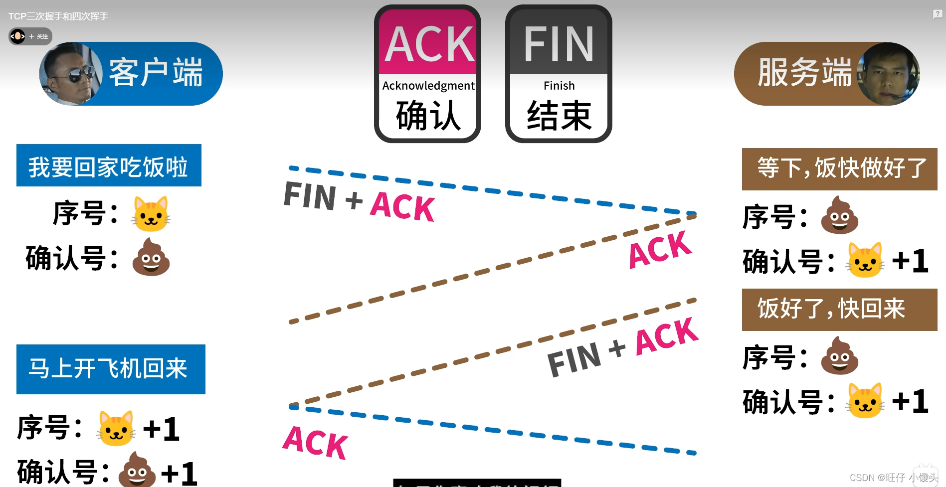 4. 最后客户端得到最终的结束确认以后,会发送ACK来进行确认。此时自己的序号需要用对方的确认号,确认号是对方的序号+1