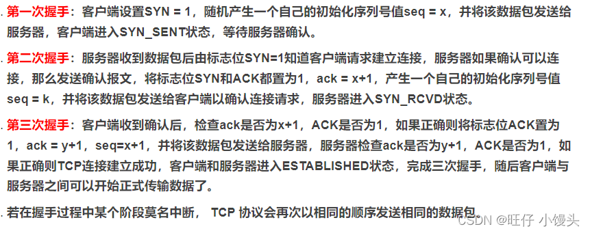简单的说,握手过程中主要使用了 TCP 的标志(flag)——SYN(synchronize) 和ACK(Acknowledgement)。发送端首先发送一个带 SYN 标志的数据包给对方。接收端收到后,回传一个带有 SYN和ACK 标志的数据包以示传达确认信息。最后,发送端再回传一个带 ACK 标志的数据包,代表“握手”结束。若在握手过程中某个阶段莫名中断,TCP 协议会再次以相同的顺序发送相同的数据包。