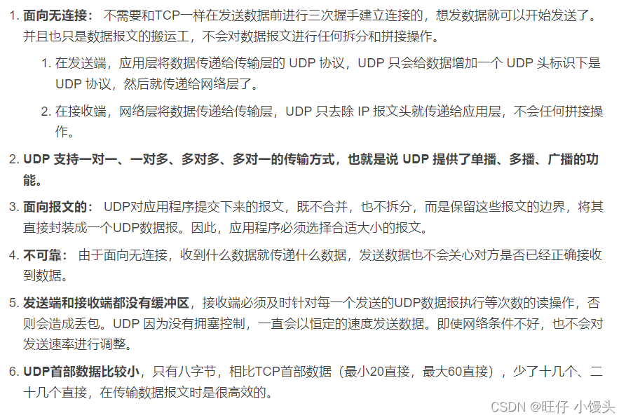 1. 首先UDP是无连接的,因此减少了开销和发送数据之前的时延