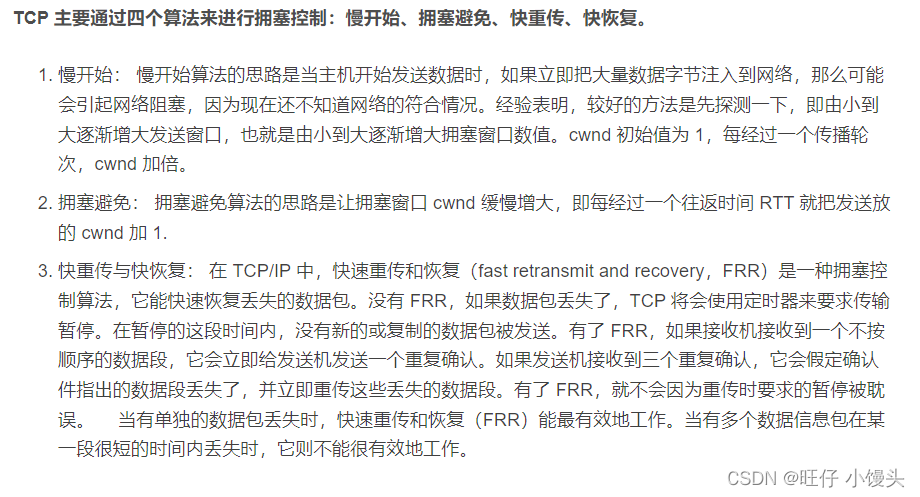 ②TCP还具有超时重传机制,发送端在发出一个TCP报文段之后启动定时器,若在超时时间范围后还没收到接收端的应答信号,它将重发该数据报文。一个报文段从发送再到接收到确认所经过的时间称为往返时间 RTT,加权平均往返时间 RTTs,超时时间 RTO 应该略大于 RTTs。