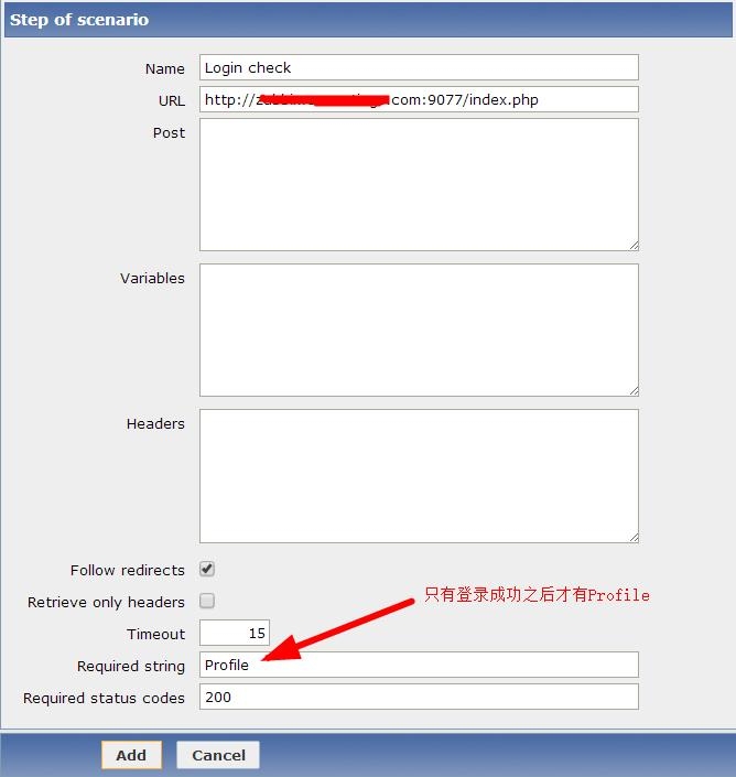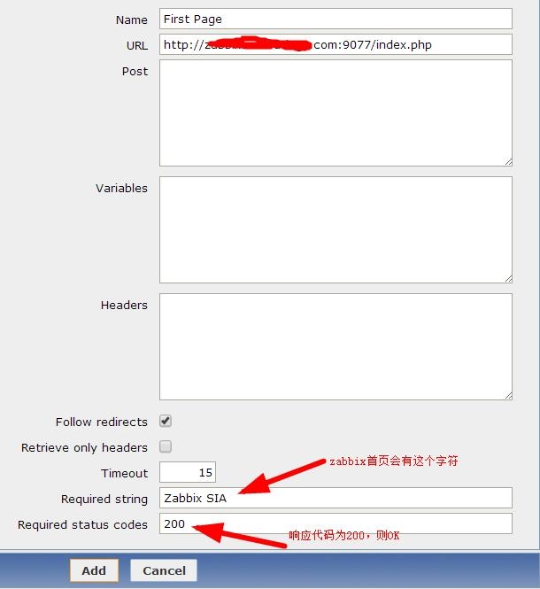 ◆ Required string:这里需要配置一个正则表达式,当获取到这个URL的返回内容时,zabbix会根据这个正则表达式在返回的HTML中寻找,
