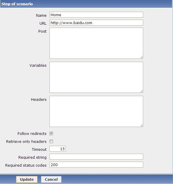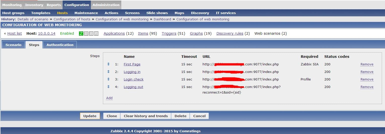 在开始之前,先介绍zabbix的一个概念——“Web scenarios”,即网络场景,就是用户为了完成某个目标,在网络上进行的一系列操作的过程。比方说,要登录微博,就是一个“网络场景”,在其中的每一个步骤操作——打开页面、发起登录请求、登录成功或者失败,在zabbix中统称为“步骤”。定义一个Web scenarios,我们需要定义其中什么步骤,以及按照什么顺序执行,然后zabbix会定期按照设置的顺序来执行这些“步骤”。