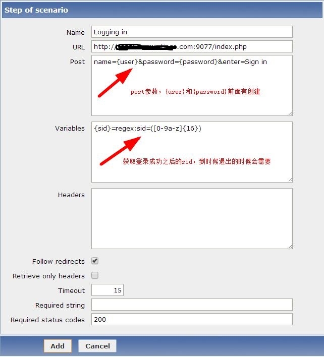 ◆ Variables:和Web scenarios的类似,不同的是这里设置的变量,只在这个步骤生效,并且只在GET、POST参数中使用有效,