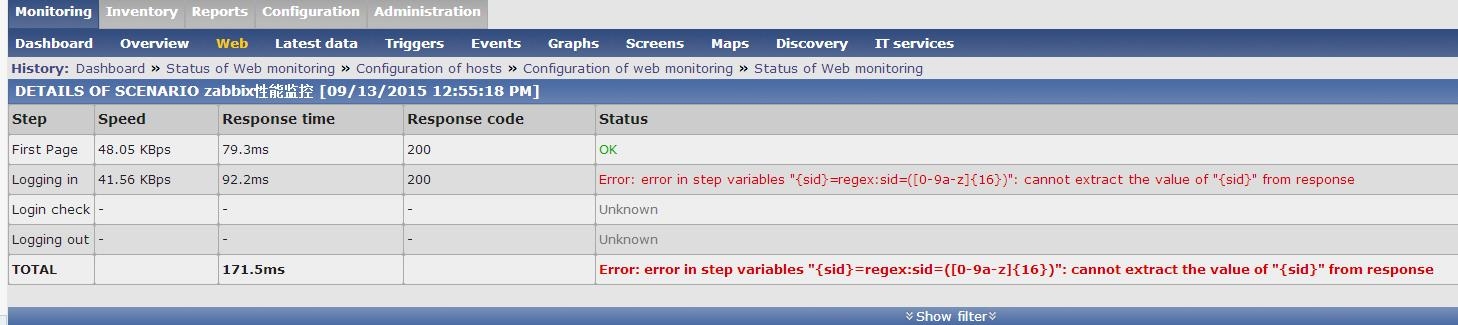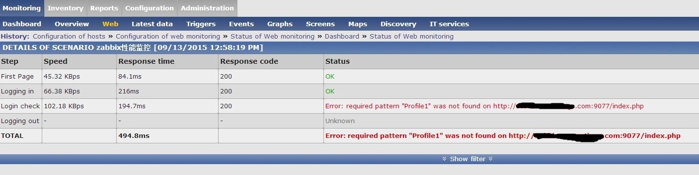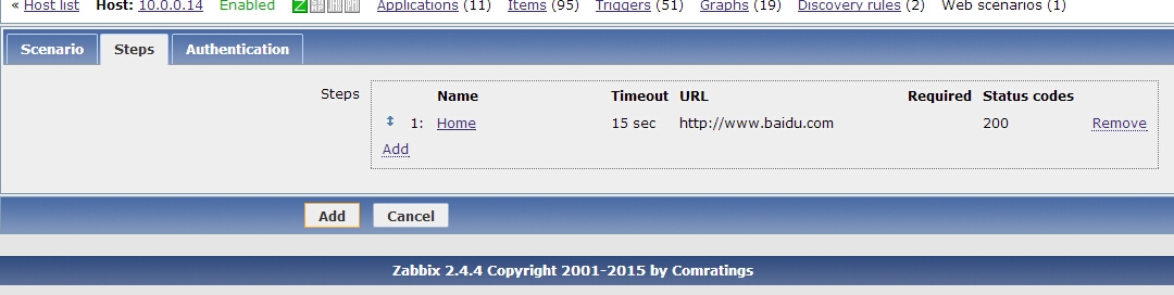 默认我们人登录网站的过程大约有这么几步,打开页面-->登录-->登录验证-->退出。就如我们有些业务页面不是单单只监控一个首页是否正常,还有监控是否可以登录,登录认证等等比较复杂的信息,这些是上面简单配置无法实现的,我们需要通过下面的例子来模拟出来,我监控的是我的zabbix网站,因为zabbix本身是有用户认证功能的。