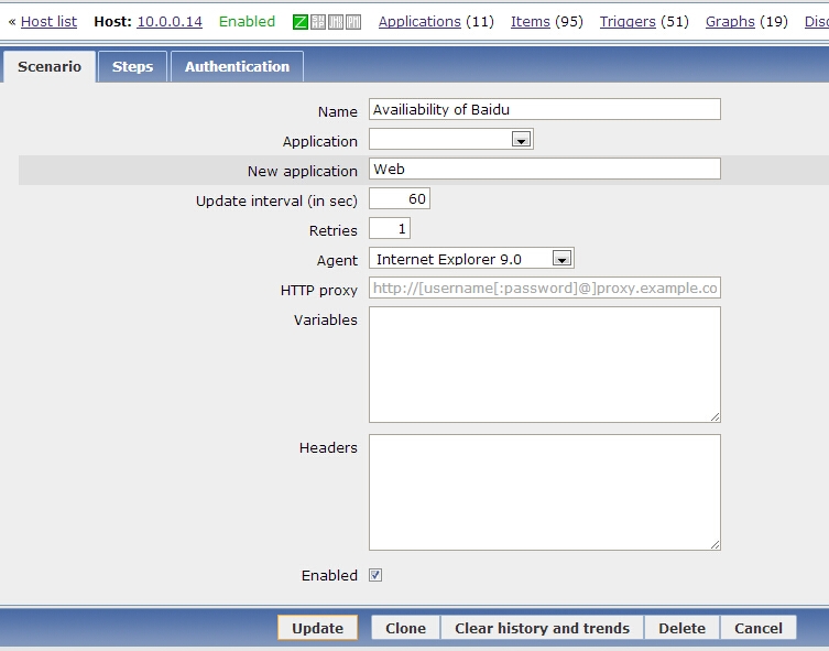 在zabbix2.2中,Web scenarios和Items、Triggers,是依附在主机或者模版上面的,这意味着Web等场景也可以在模板上创建并且可以应用在多个主机上。