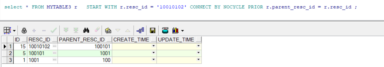 select * from mytable3 r start with r.resc_id = '10010102' connect by nocycle prior r.parent_resc_id = r.resc_id ;