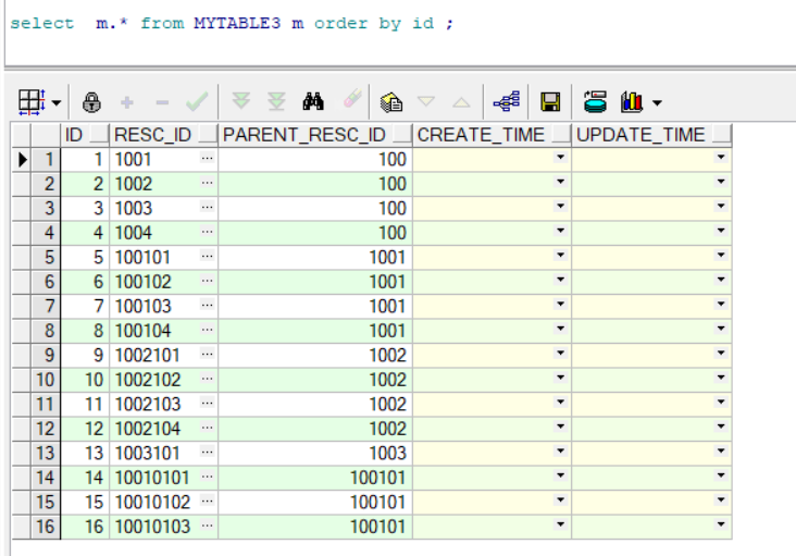 select * from mytable3 r start with r.resc_id = '1001' connect by nocycle prior r.resc_id = r.parent_resc_id;