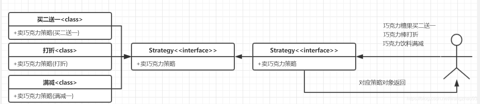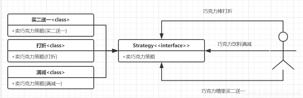查理想要扩大自己的巧克力工厂,但是他还是一个小孩,很多东西都不知道,那么他就只能让旺卡想出很多种销售模式,来进行提高销量,比如买二送一、满300减120、特价商品打个6折如此如此,那么由查理进行挑选那种策略模式的时候,他需要怎么处理了?旺卡把所有的销售策略都列出来,然后一个个讲给查理听,然后让他来做决定,那么这样和由查理来想策略有什么差别了?那么查理当然是应该是对旺卡说:我想巧克力棒打折、巧克力饮料满减、巧克力糖果满2送1的策略,那么旺卡了解之后,来调用对应的资源就行了,不是吗?有什么比做一个甩手掌柜爽了?