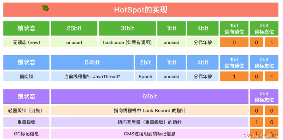 展开MarkWord,MarkWord中标记着四种锁的信息:无锁、偏向锁、轻量级锁、重量级锁