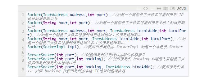 构造方法的参数中,address、host和port分别是双向连接中另一方的IP地址、主机名和端 口号,stream指明socket是流socket还是数据报socket,localPort表示本地主机的端口号,localAddr和bindAddr是本地机器的地址(ServerSocket的主机地址),impl是socket的子类,既可以用来创建serverSocket又可以用来创建Socket。count则表示服务端所能支持的最大连接数。