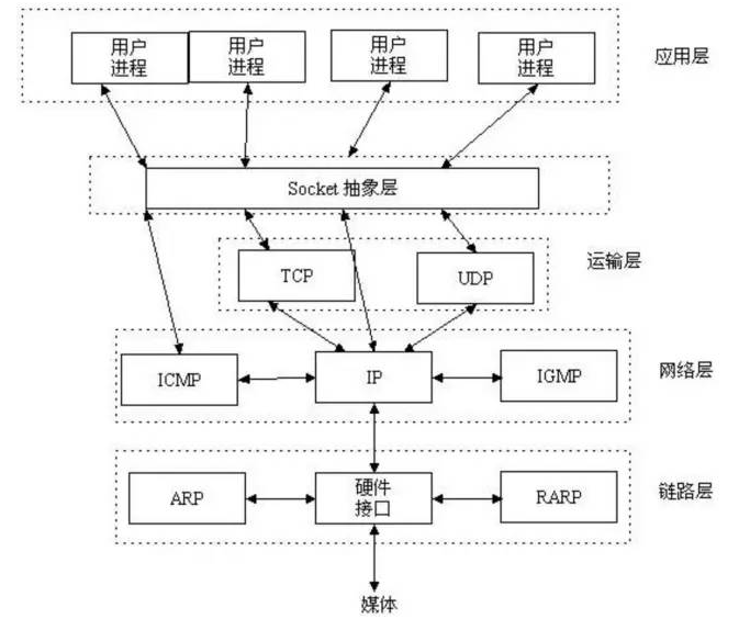 网络层:IP协议、ICMP协议、ARP协议、RARP协议和BOOTP协议;
