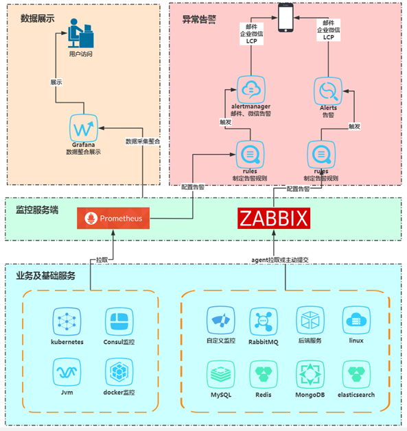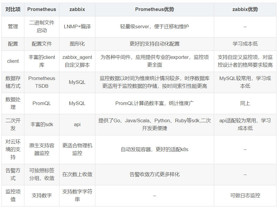 公司之前一直使用的是zabbix+grafana的监控方式,随着我们的微服务推行容器化后,k8s应用的监控需求增加,Prometheus会更适合容器的监控。另外,Prometheus用的就是自研的 TSDB,Zabbix 则用的是 MySQL 或 PostgreSQL,在高并发的情况下,时序型数据库读写性能是远高于关系型数据库的,同时还提供了很多内置的基于时间的处理函数,简化数据聚合的难度。因此我们现在也逐步将Zabbix迁移到Prometheus。目前监控平台采集覆盖基础资源38项,102个组件、9项业务监控。