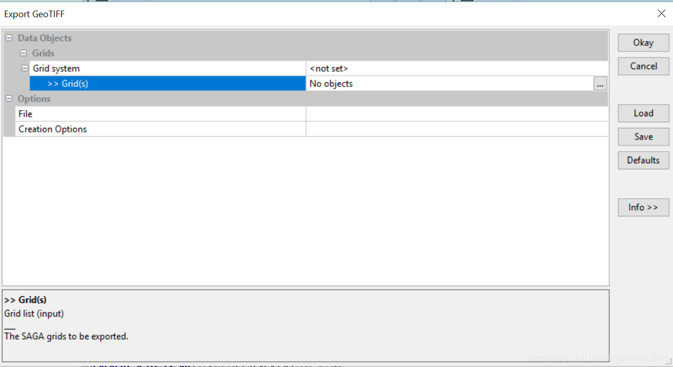 - 将各个波段导出为单独的影像:Tools——Import/Export——GDAL/OGR——Export GeoTIFF,在Girds选项中选择需要导出的波段,存为t影像