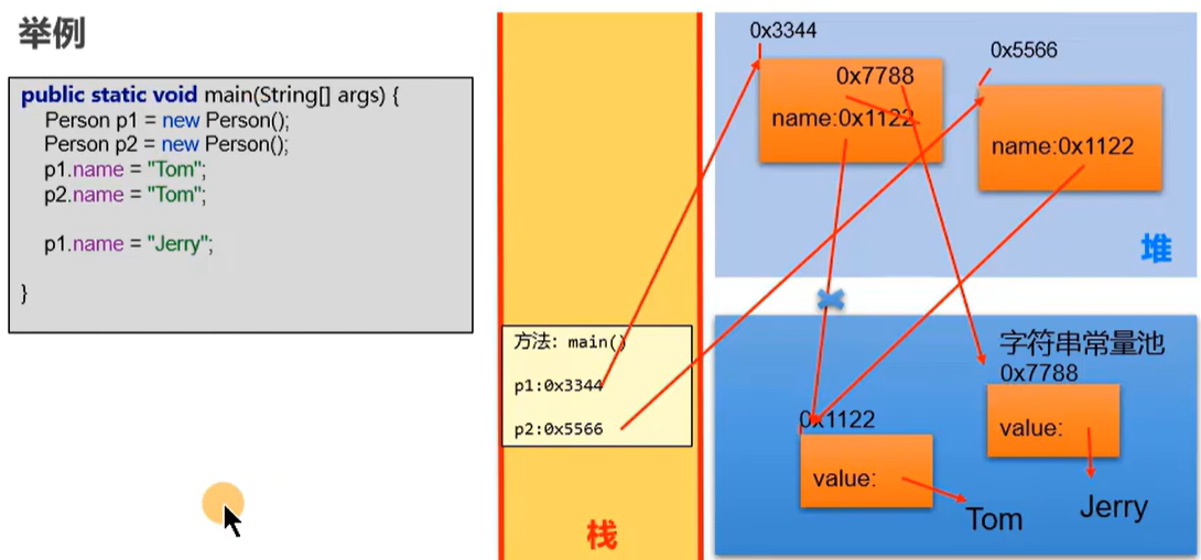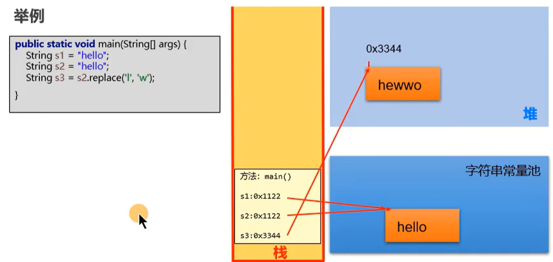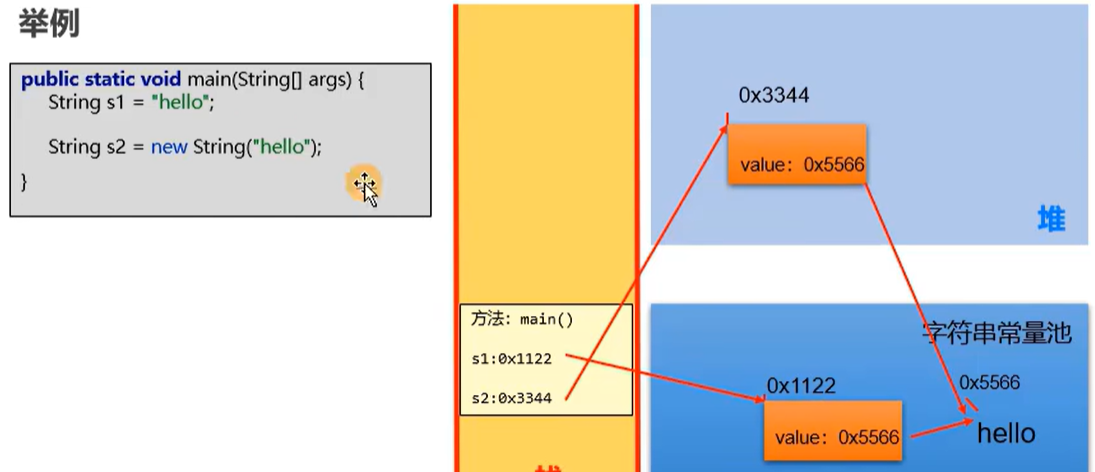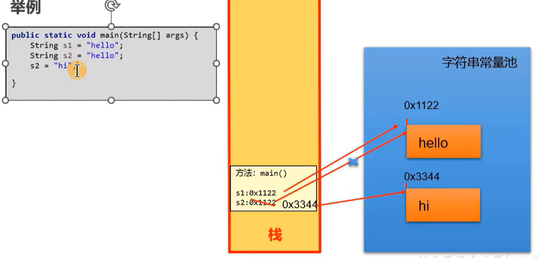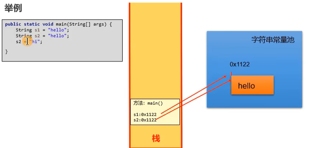 因为不允许存放两个相同的字符串常量,所以下面两个hello在字符串常量池中地址相同