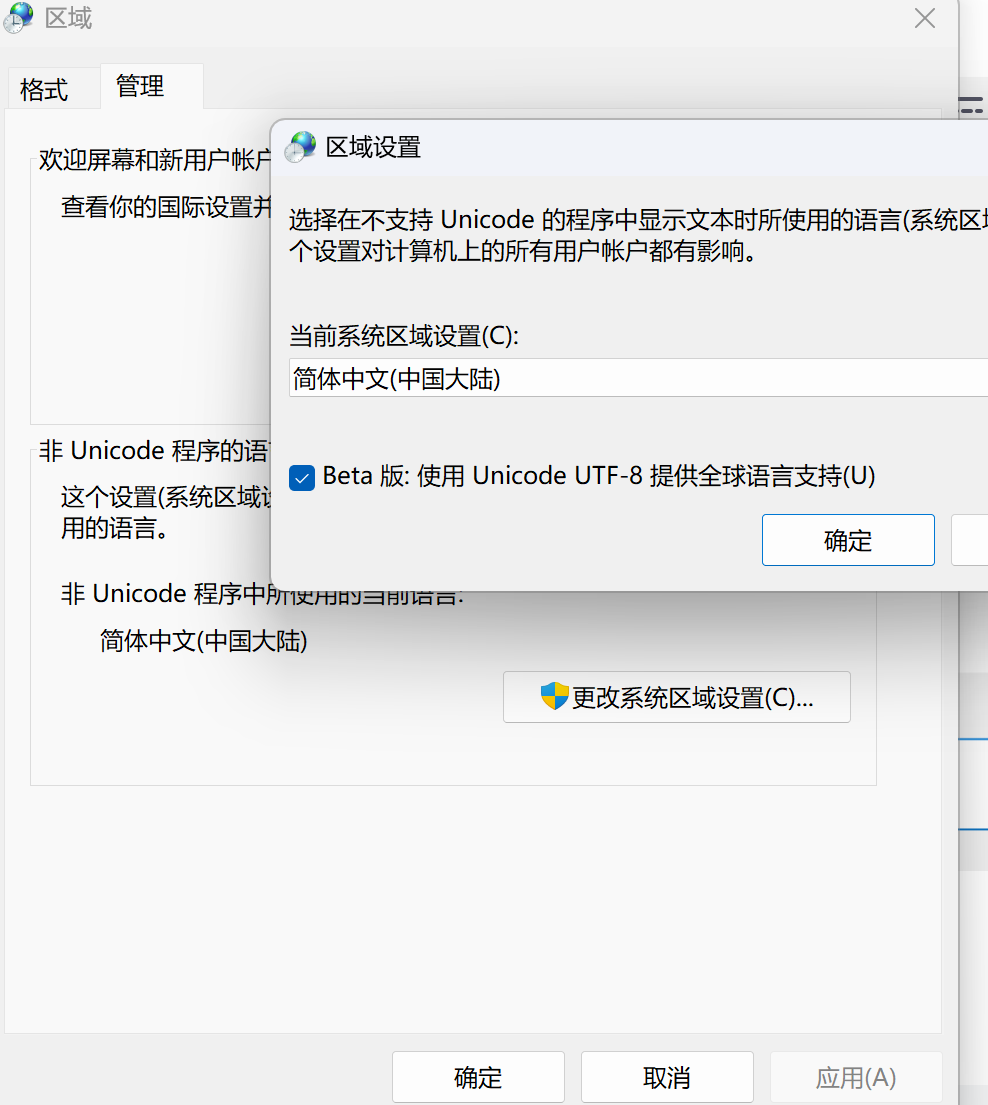 对于情况2,如果你真的勾选了上面的Beta选项,那请况2的问题才会出现,也就是系统只能选择utf-8解释器,ansi文件必然乱码。因为这是你勾选Beta的必然结果:“使用Unicode UTF-8”。这样就会限制你使用ansi编码的文件。怎么办呢?也很简单,取消勾选,重新启动电脑,你的系统又能自动识别编码,自动匹配解释器啦!