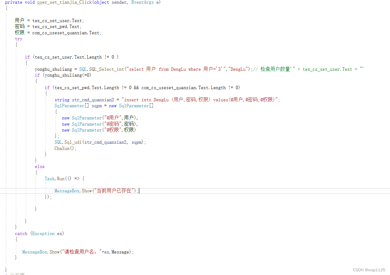 作为一个初学者,开发小程序的时候,就是打开一个子窗体,里面管理登陆用户的,添加用户的时候要检测用户是否已经存在,如果用户已经存在,就不能添加用户,要弹窗提示。开始实验的时候,输入的用户已经存在,点击添加,然后界面卡死,子窗体和主窗体都卡死,后来添加了一个TASK.RUN(()=>{}),解决了卡死的问题,弹出也正式出现