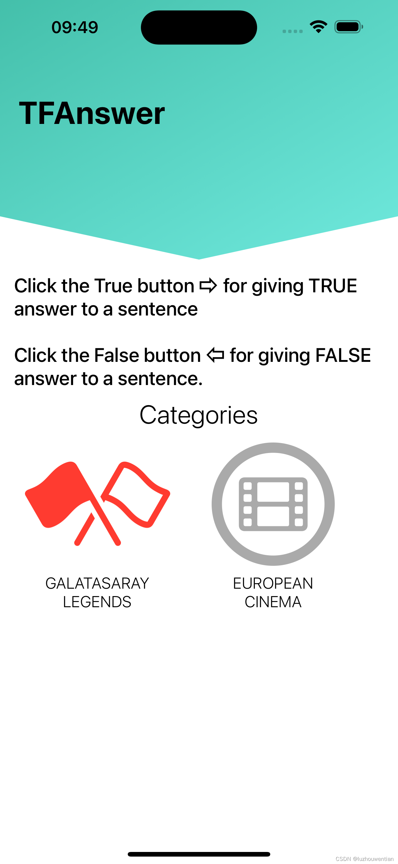 There are two categories that have true and false questions. One need to move his/her face to right for giving true to a question or else move his/her face to the left for giving false to a question.