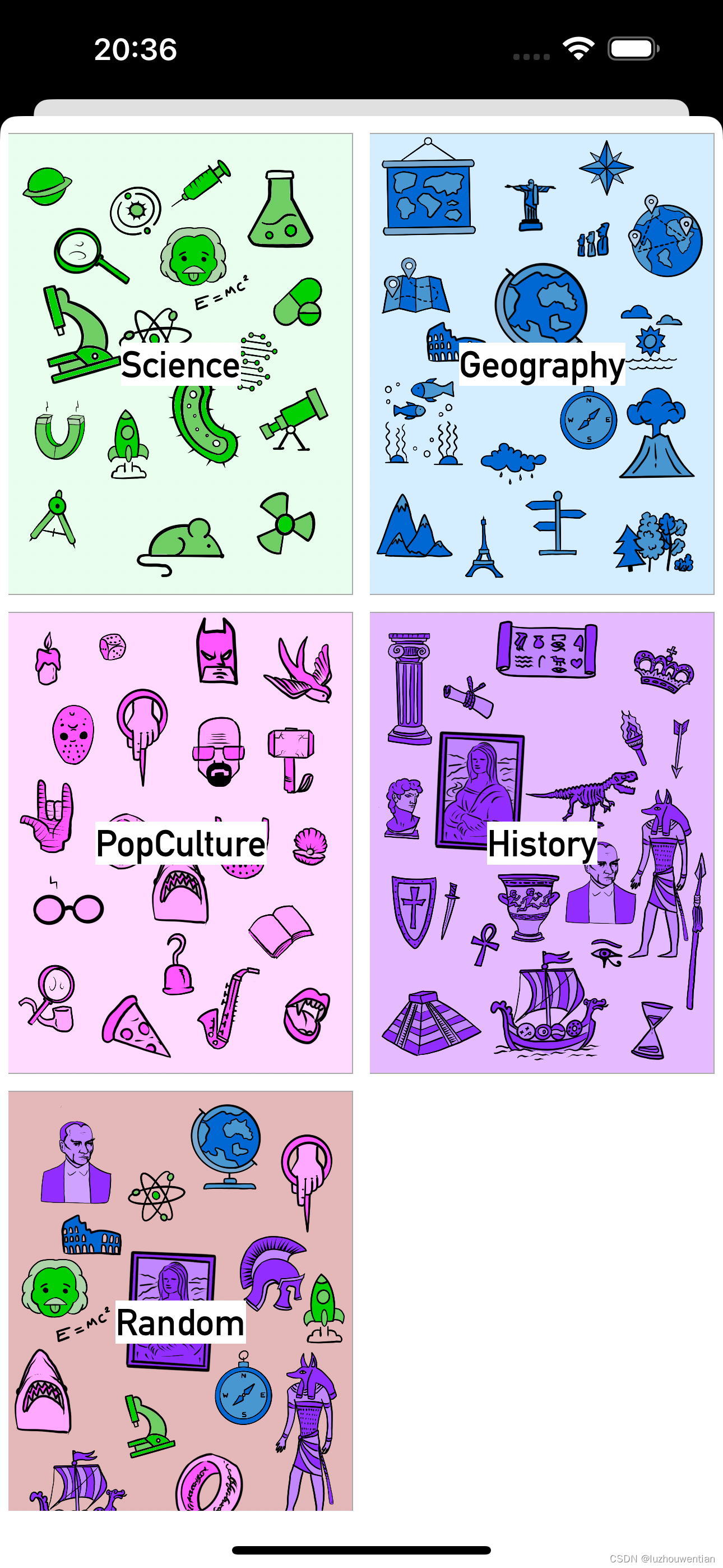 CHAnswerBgm is a knowledge multiple-choice application with two options from which to choose the correct answer. It is divided into five categories: Science, Geography, PopCulture, History, and Random.