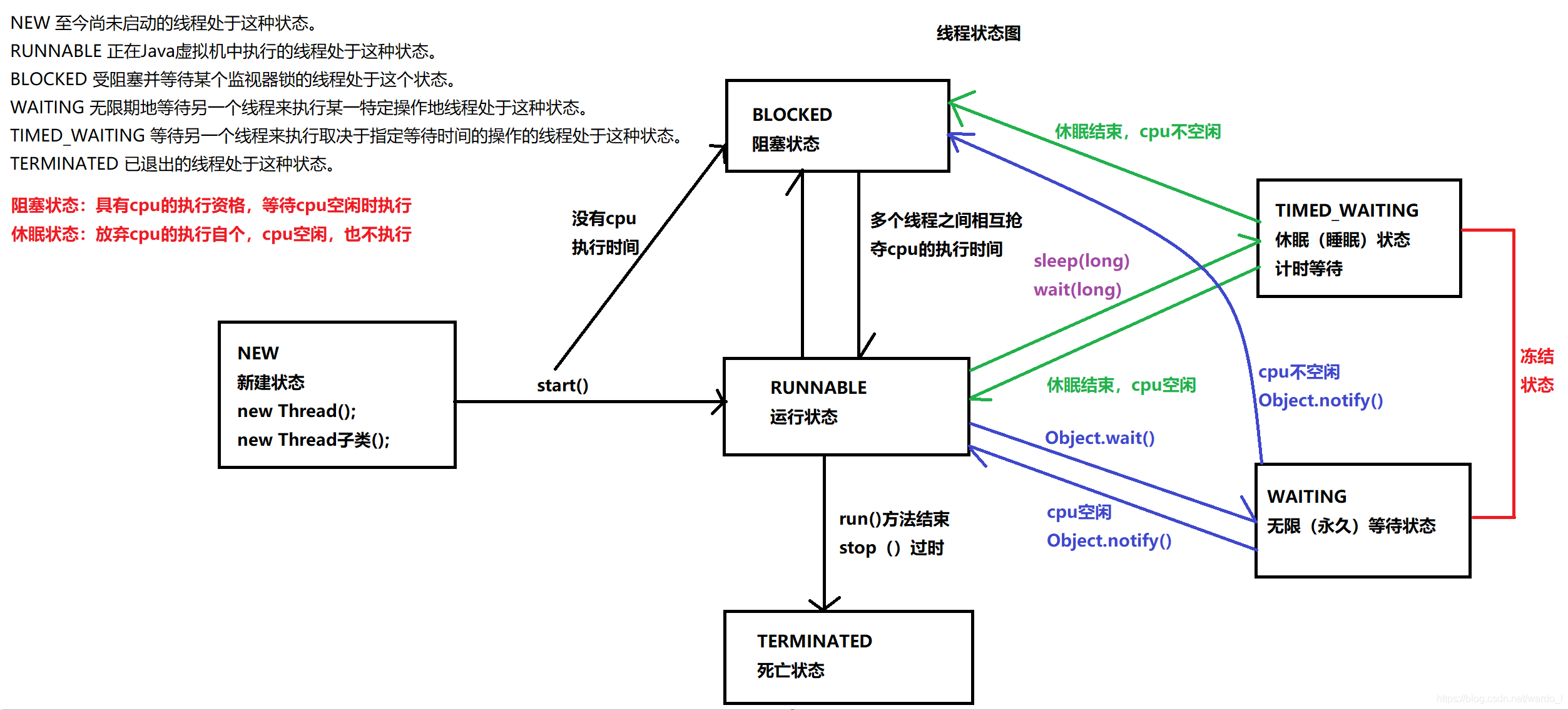 | Teminated(被终止) | 因为run方法正常退出而死亡,或者因为没有捕获的异常终止了run方法而死亡。 |