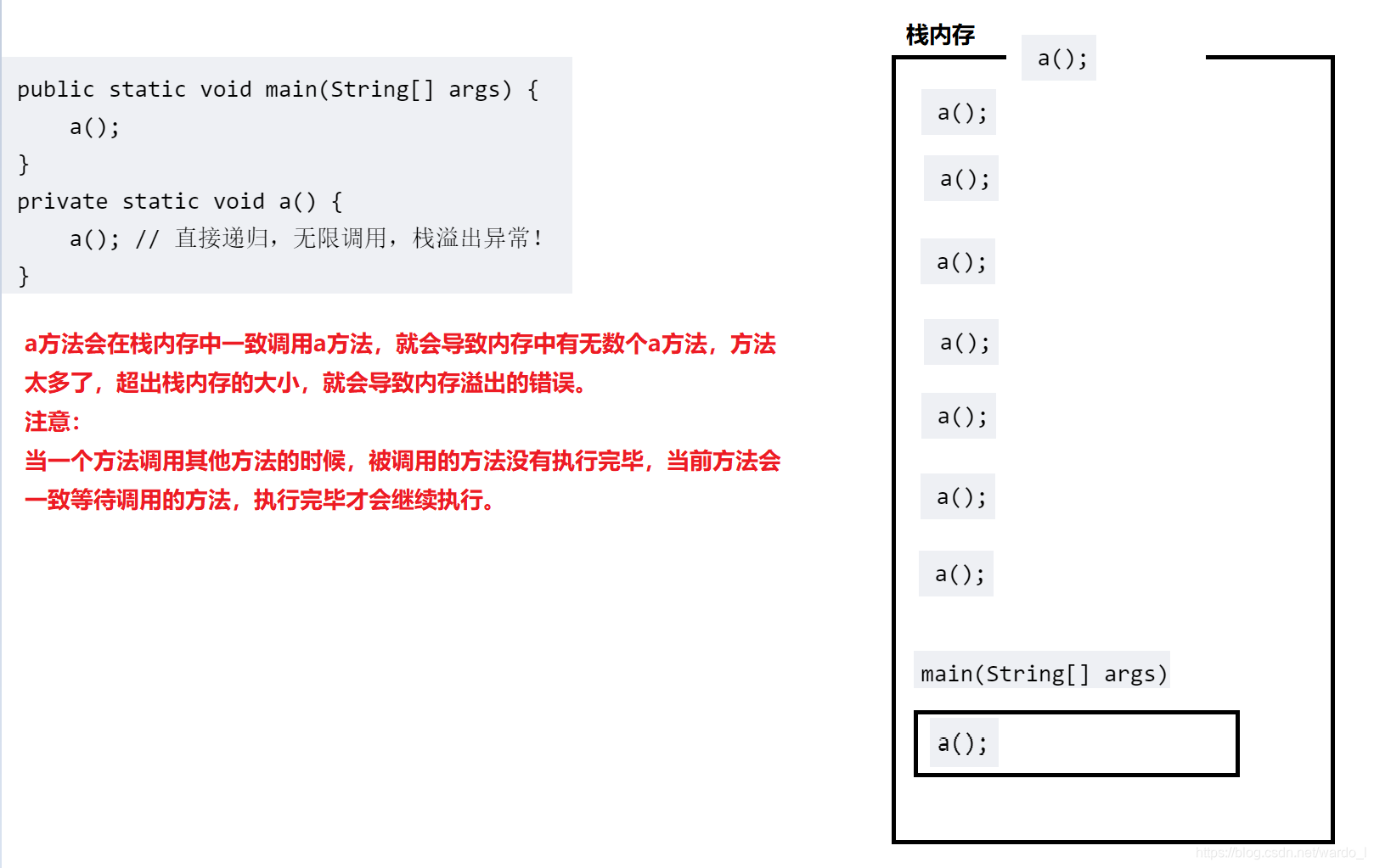 main方法压栈执行,调用a方法,继续压栈,。。。