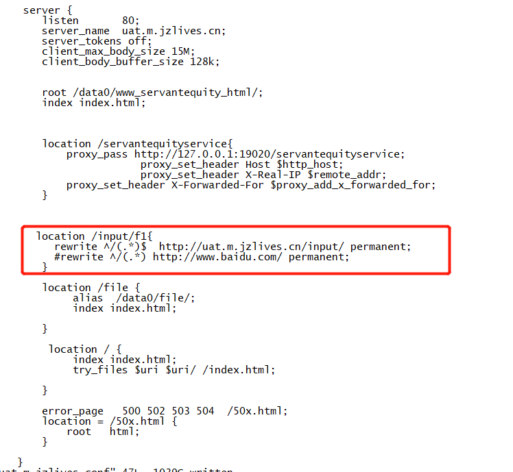 rewrite ^/(.*)$ http://uat.m.jzlives.cn/input/ permanent;