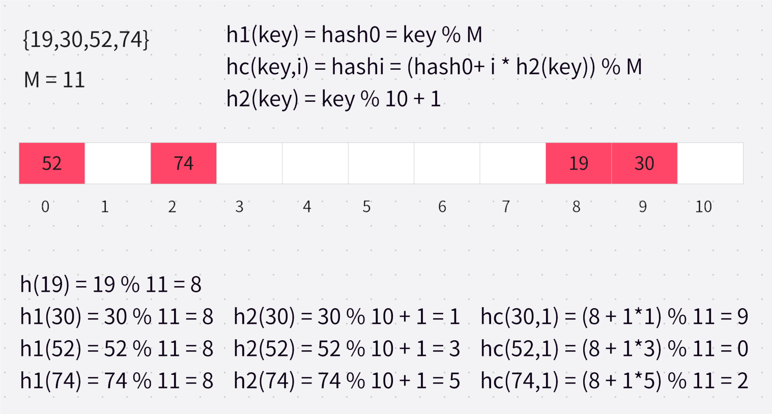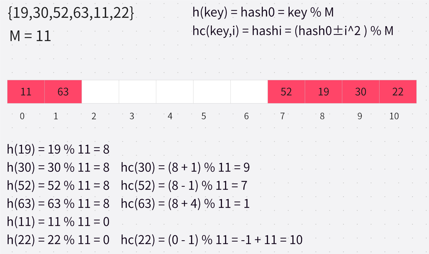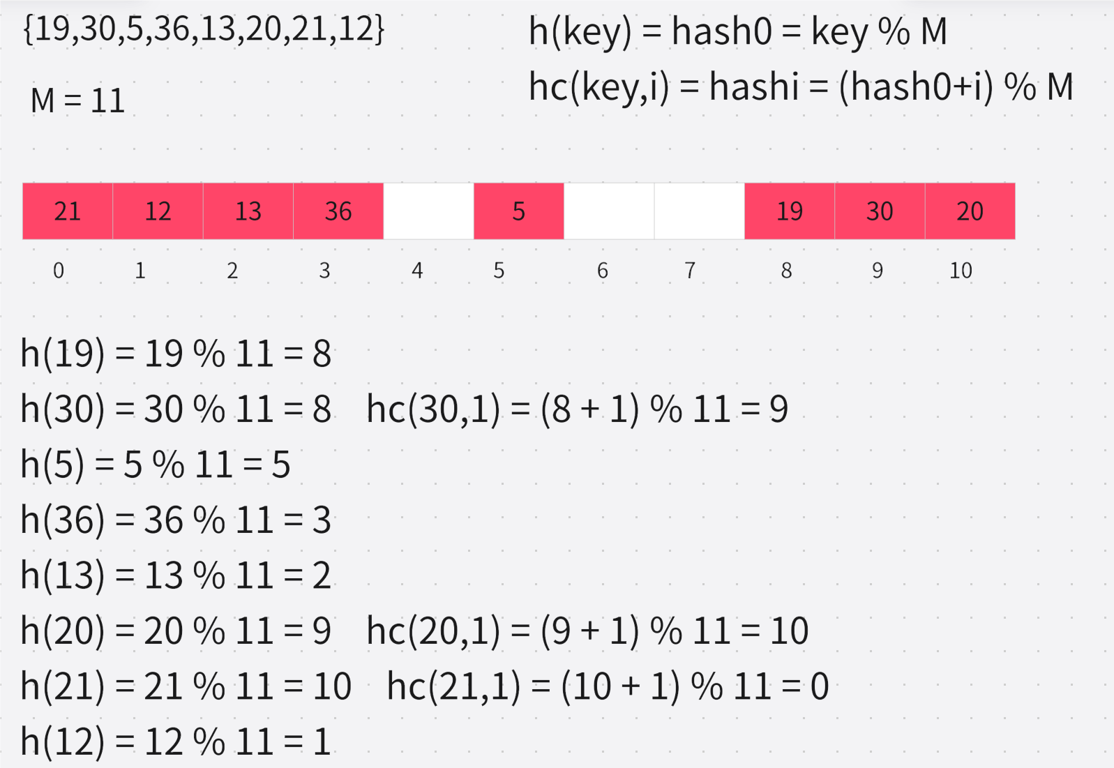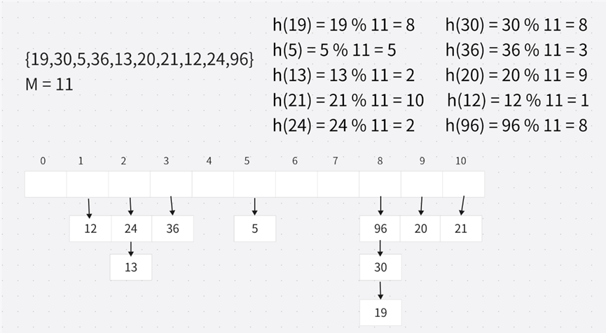 下面来演示使用链地址法将 {19,30,5,36,13,20,21,12,24,96} 这组值值映射到 M=11 的表中: