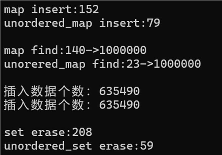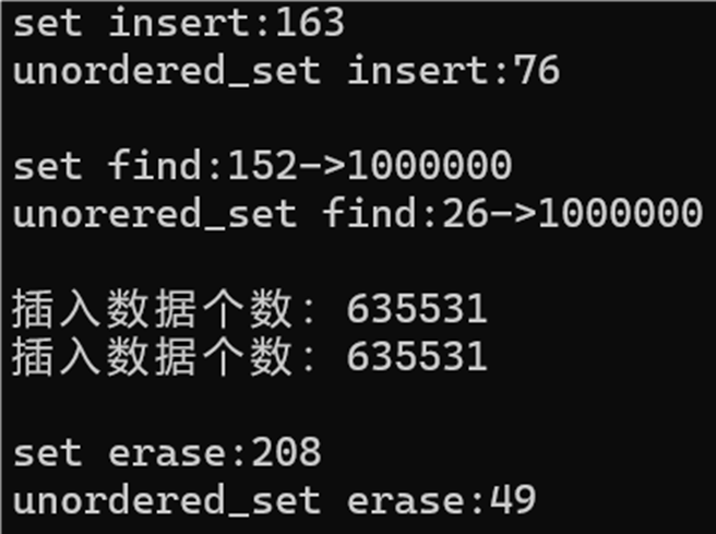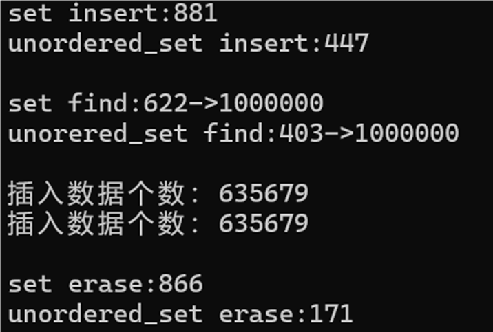 cout << "unorered_set find:" << end4 - begin4 << "->" << m2 << endl;