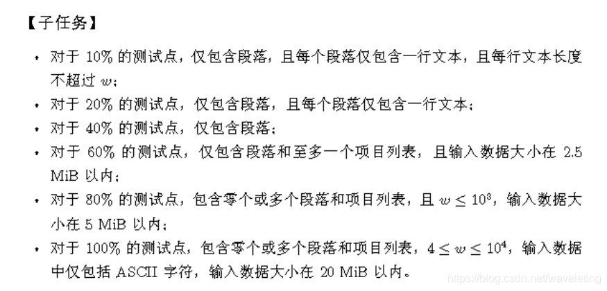 对于10%的测试点,仅包括段落,且没个段落仅包含一行文本,且每行文本长度不超过w;