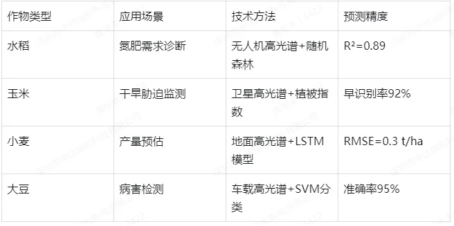 空间分辨率:高光谱成像可实现单株或田块尺度的空间解析。