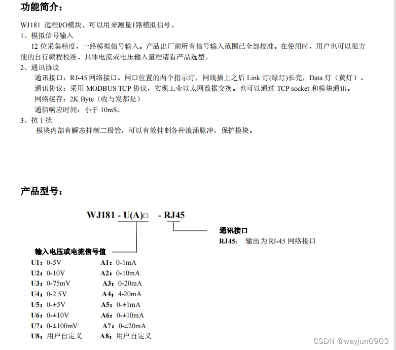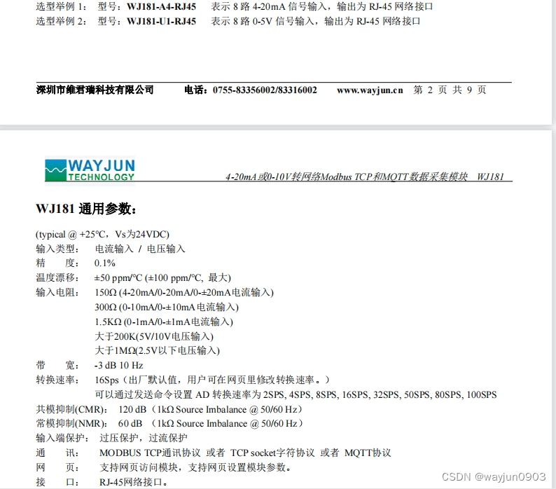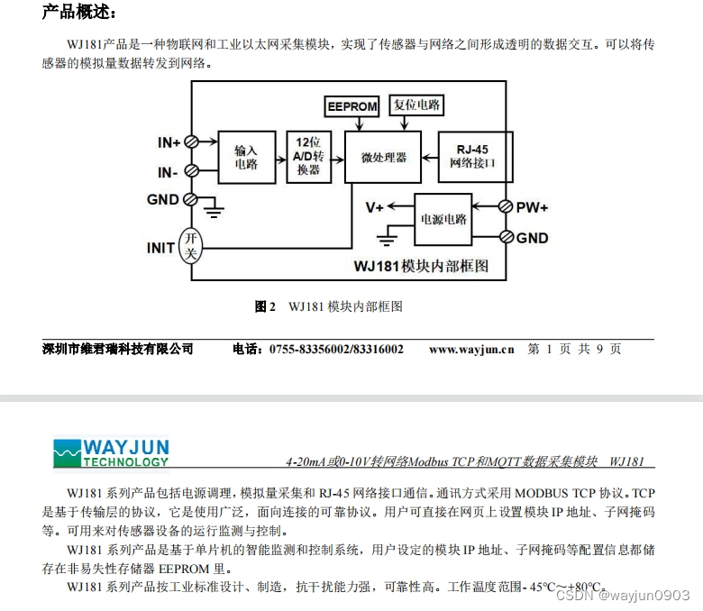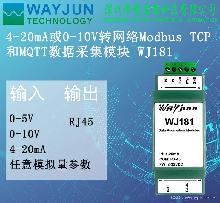 WJ181是一款集成了4-20mA信号转ModbusTCP和MQTT协议的模块,支持网页查询,宽电源供电,便于安装和编程。适用于工业自动化、楼宇控制和传感器信号测量等多种场景。