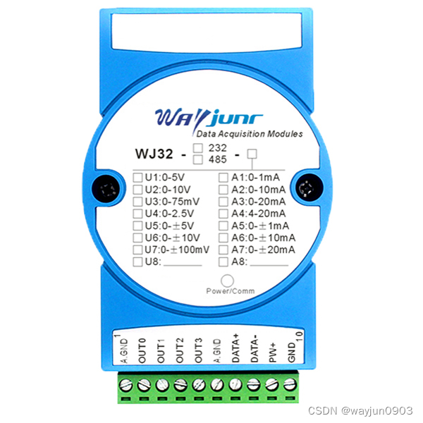 产品包括电源隔离,信号隔离、线性化,D/A转换和RS-485串行通信。每个串口最多可接255只 WJ32系列模块,通讯方式采用ASCII码通讯协议和MODBUS RTU通讯协议,自动识别通讯协议并回复,波特率可由代码设置,能与其他厂家的控制模块挂在同一RS-485总线上,便于计算机编程。