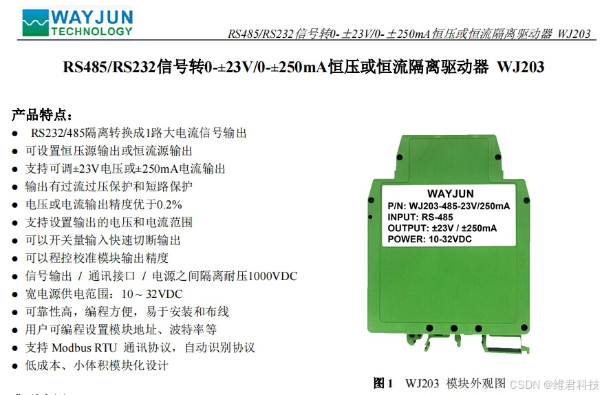 WJ203系列产品可应用在RS-485总线工业自动化控制系统,0~±23V或0~±250mA输出,用来控制工业现场的执行设备,