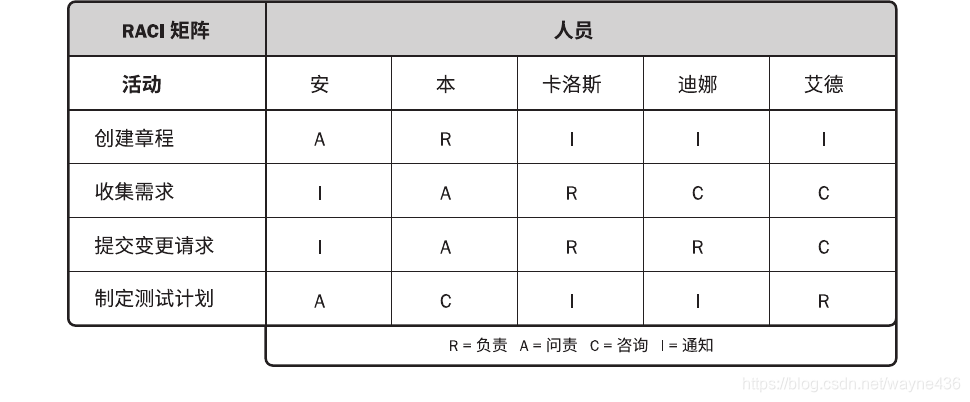 RACI(执行、负责、咨询和知情)矩阵,如图所示。图中最左边的一列表示有待完成的工作(活动)。分配给每项工作的资源可以是个人或小组,项目经理也可根据项目需要,选择“领导”或“资源”等适用词汇,来分配项目责任。如果团队是由内部和外部人员组成,RACI 矩阵对明确划分角色和职责特别有用。