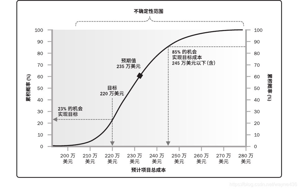 应在风险管理计划中记录项目关键相关方的风险偏好。他们的风险偏好会影响规划风险管理过程的细节。特别是,应该针对每个项目目标,把相关方的风险偏好表述成可测量的风险临界值。这些临界值不仅将联合决定可接受的整体项目风险敞口水平,而且也用于制定概率和影响定义。以后将根据概率和影响定义,对单个项目风险进行评估和排序