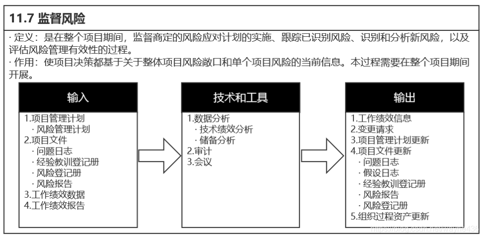 监督风险过程需要定期安排风险审查会,用来检查和记录风险应对在处理整体项目风险和已识别单个项目风险方面的有效性。