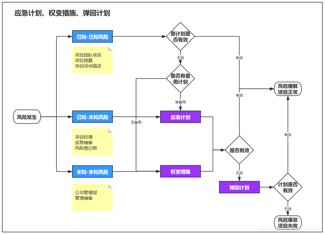 应急计划是事先制定的风险应对计划。弹回计划与应急计划都可以针对威胁或机会,而权变措施只能针对威胁。