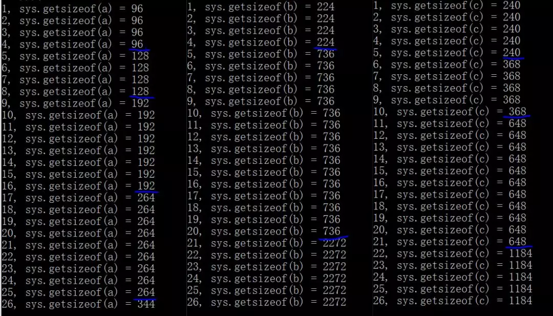 以上的可变对象在扩充时,有相似的分配机制,在动态扩容时可明显看出效果。