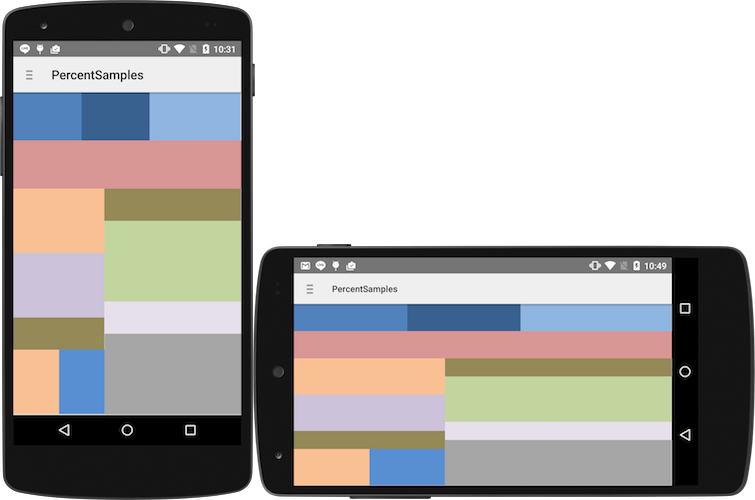 <android.support.percent.PercentRelativeLayout xmlns:android="http://schemas.android.com/apk/res/android" xmlns:app="http://schemas.android.com/apk/res-auto" android:layout_width="match_parent" android:layout_height="match_parent"> <View android:id="@+id/top_left" android:layout_width="0dp" android:layout_height="0dp" android:layout_alignParentTop="true" android:background="#ff44aacc" app:layout_heightPercent="20%" app:layout_widthPercent="70%" /> <View android:id="@+id/top_right" android:layout_width="0dp" android:layout_height="0dp" android:layout_alignParentTop="true" android:layout_toRightOf="@+id/top_left" android:background="#ffe40000" app:layout_heightPercent="20%" app:layout_widthPercent="30%" /> <View android:id="@+id/bottom" android:layout_width="match_parent" android:layout_height="0dp" android:layout_below="@+id/top_left" android:background="#ff00ff22" app:layout_heightPercent="80%" /> </android.support.percent.PercentRelativeLayout>