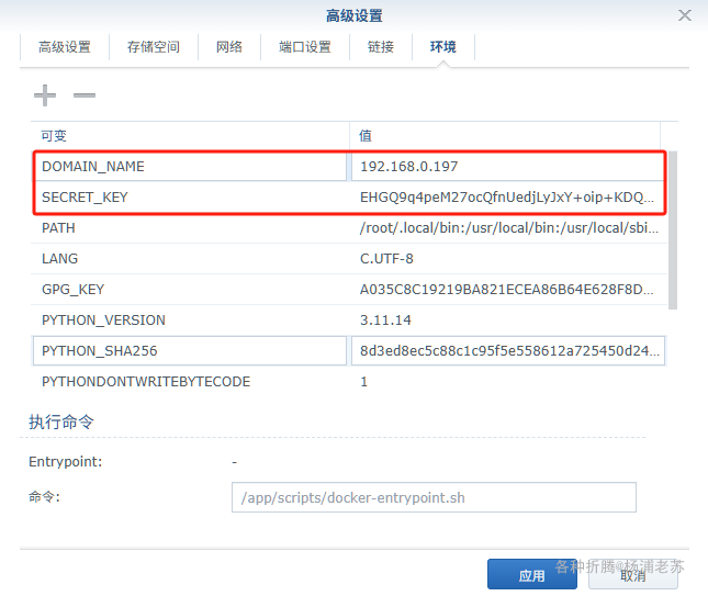 DOMAIN_NAME | (必填)指定服务器的 IP 地址或域名。其中 192.168.0.197 为老苏群晖主机的 IP |