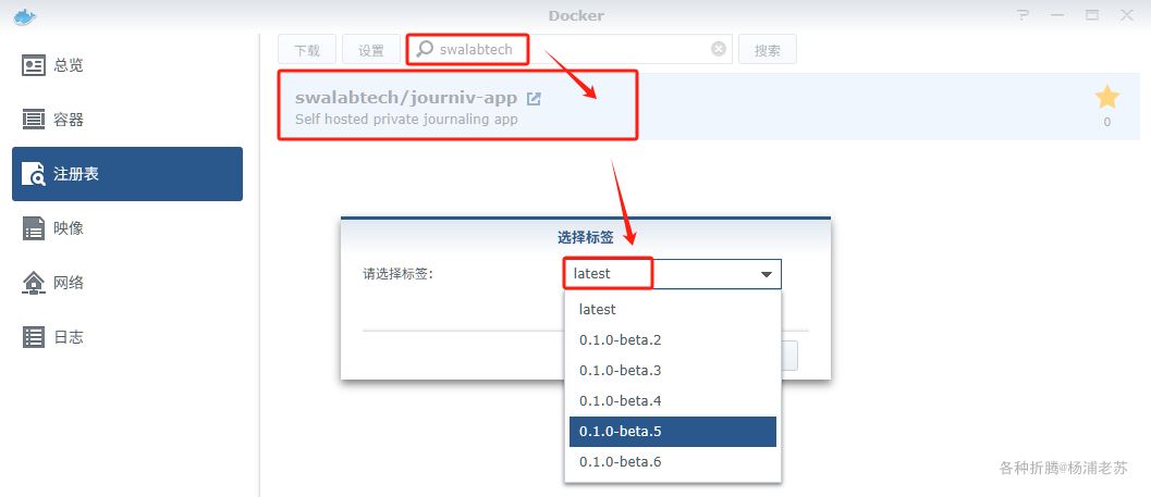 在注册表中搜索 swalabtech ,选择第一个 swalabtech/journiv-app,版本选择 latest。