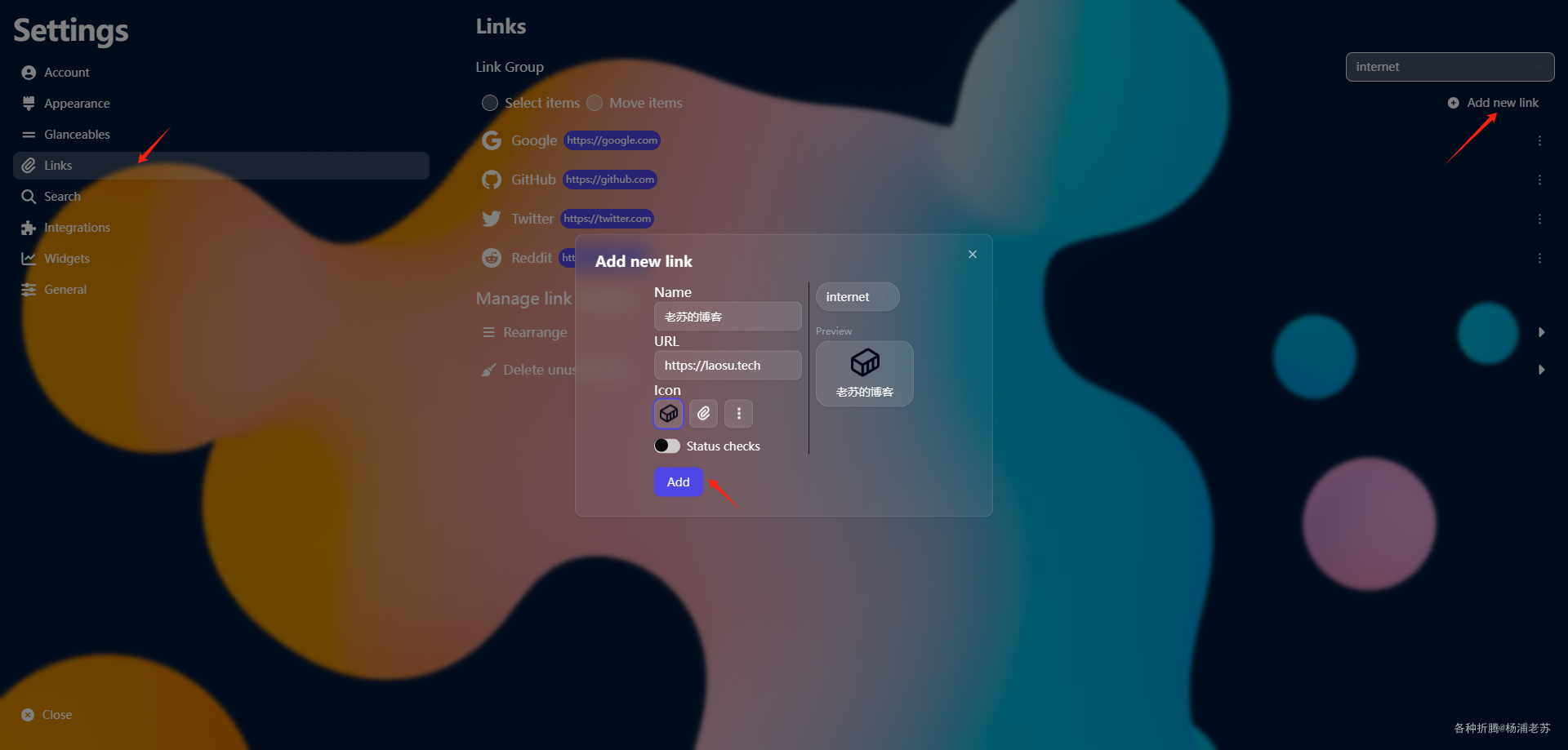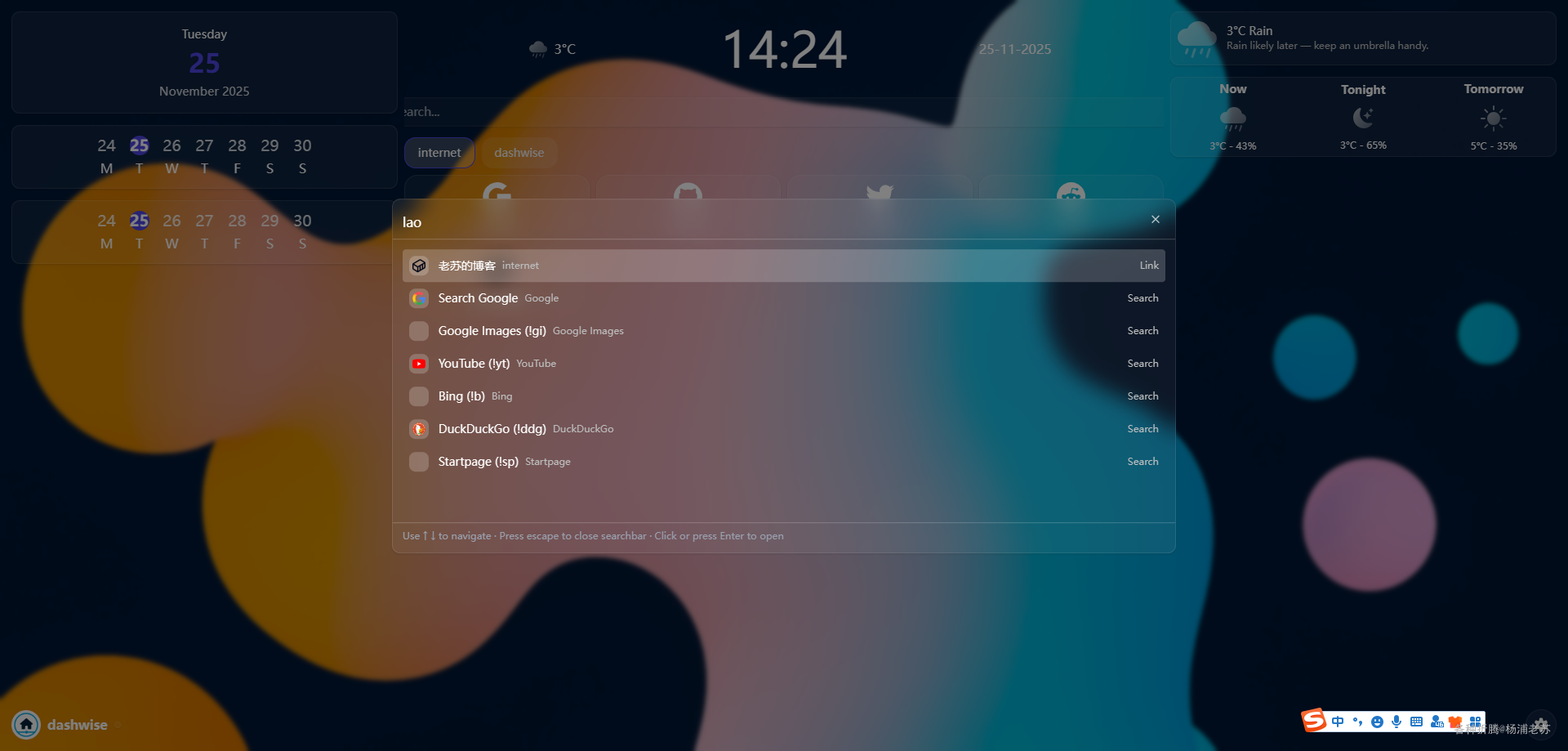 Ctrl+K快速启动搜索,轻松查找链接、集成或使用搜索引擎。 - 直接集成:与您其他的自托管应用深度集成(目前已支持