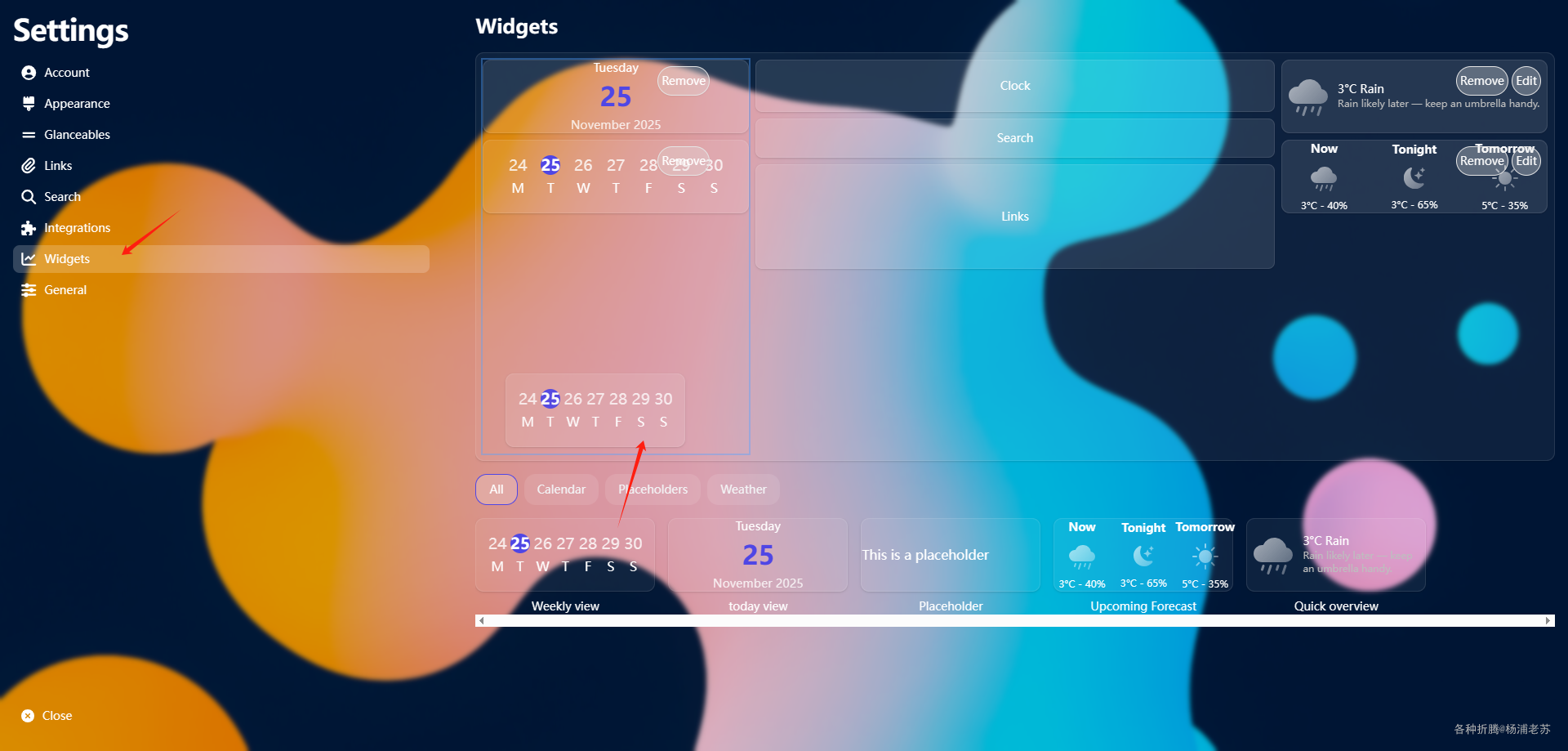 右下角进入 Settings --> Widgets,可以通过拖拽对主界面进行编排