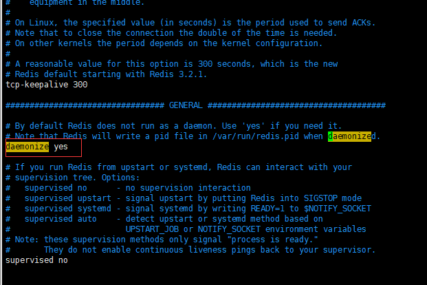 通过 /daemonize 查找到属性,默认是no,更改为yes即可。 (通过/关键字查找出现多个结果则使用 n字符切换到下一个即可,查找到结果后输入:noh退回到正常模式)